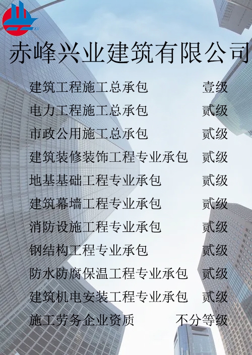 赤峰興業(yè)建筑有限公司簡介 赤峰興業(yè)建筑有限公司成立于1998年7月,位于內(nèi)蒙古赤峰市松山區(qū)。現(xiàn)已發(fā)展成為擁有建筑工程施工總承包壹級、電力工程施工總承包貳級、市政公用工程施工總承包貳級、承裝、修、試四級、?建筑裝修裝飾工程專業(yè)承包貳級、建筑幕墻工程專業(yè)承包貳級、消防設施工程專業(yè)承包貳級、地基基礎工程專業(yè)承包貳級、鋼結(jié)構工程專業(yè)承包貳級、建筑機電工程專業(yè)承包二級、防水防腐保溫工程專業(yè)承包貳級以及建筑施工勞務等資質(zhì)的綜合性建筑施工企...